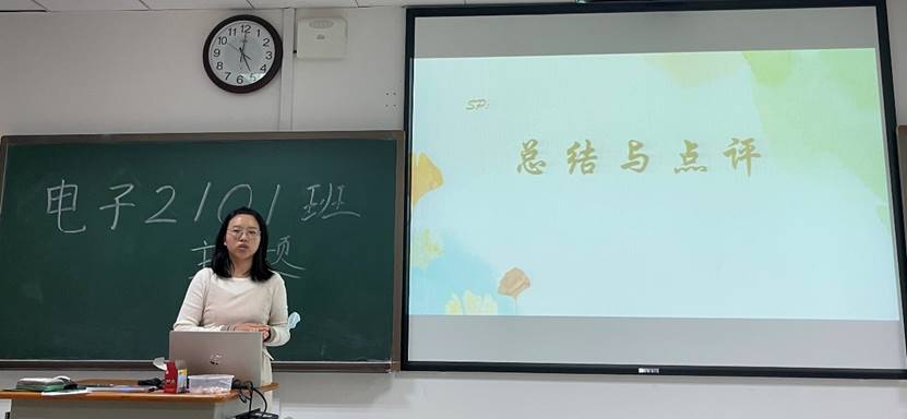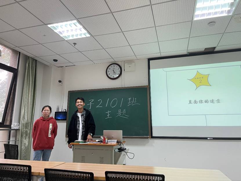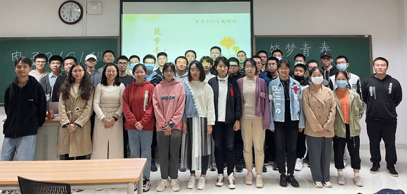 党委副书记陈军、本科2021级辅导员金晶老师、班主任陶明老师和电子2101班学助刘焕瑶、庄祖亮参加。本次班会由班长邓雪健主持,全体同学参与。