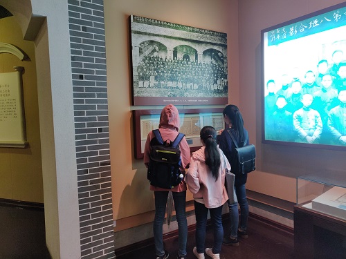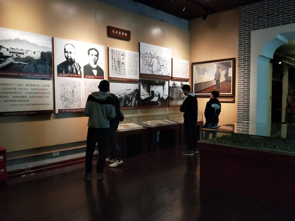 虽然天气并不算太好,天空一直下着小雨,乌云徘徊在人们的头顶,空气也因秋天的到临凉了下来,时间仿佛加快了两小时,气氛也有点压抑,但是大家的却没有感到寒冷,或许是被党的光辉所温暖,又或许是因为心中充满了对活动的期待。三点,大家准时到达目的地,迎接同学们的就是第一师范学校那庄严的面孔,灰色与蓝色相间的建筑散发着沉着冷静的气息,然而从内发出的淡黄灯光又给其增添了一分暖意,于是同学们都迫不及待地走了进去,入门是一个总览图,一共二十个部分,有用来介绍第一师范学校的历史和伟大的毛主席在学校的学习经历的六个展厅,还有当时毛主席曾经上课的教室和寝室,最引人注目的还是那时的大礼堂,偌大的礼堂里整整齐齐地摆放着近百个长木椅,内置风扇,最前方则是一个大舞台,礼堂并没有开灯,显得有些昏暗,同学们在这些古朴建筑的屋檐下,发现除了有用来展示的教室和展厅,还有许多正在使用的教室,此时仍有学生在上自习,随着更加深入的参观,同学们发现现在的第一师范学校旧址似乎成了学生上课的地方,而在旧址后面还存在着操场与图书馆,虽然有一些老旧,但看起来别有一番风味,也有人发出若是能于此上课该多么好之类的感慨,是啊,这些都是历史的遗产,看着周围的一座座高楼大厦,大家不免有些感到恍惚,曾经发生在这里的峥嵘岁月,都已付笑谈中了。