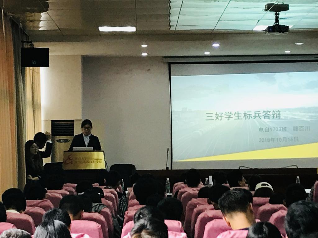 院楼可谓热闹非凡,来自20个星级班级的答辩人与校三好标兵候选人齐聚一堂,进行个人与班级的答辩会。在本次答辩会中,电自1703班表现不俗,除了班级入选四星级班级之外,班级的优秀尖子生——滕百川也作为校三好标兵候选人进行了个人风采展示。