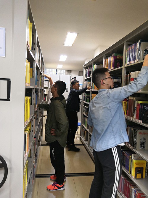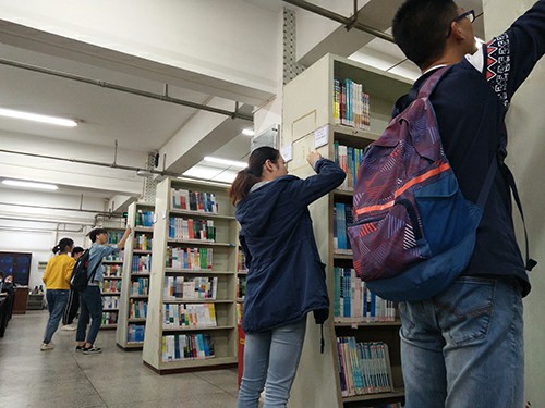 图书馆门口,跟随着团支书进入了图书馆。在图书馆管理人员的安排下,各同学明确了自己的任务,有条不紊的工作由此展开了。