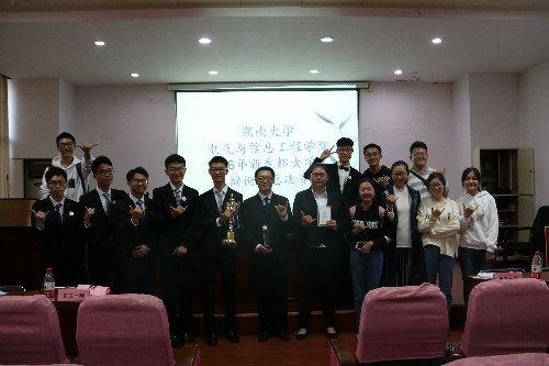 辩论队带队成员表达对冠军班级的祝贺,并与电自1806辩论队全体成员合照。