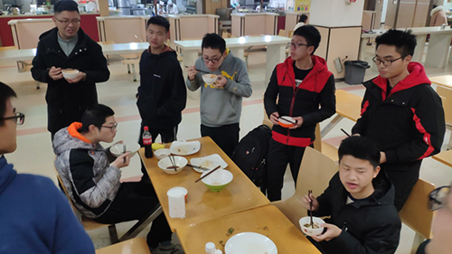 25日下午,在班长、组织委员等班委的带领下,同学们如约到达了食堂二楼。在向食堂阿姨借齐全餐具并准备好场地后,活动就正式开始了。与班委料想的不同,班上还是有很多很多人会包饺子的,其中更不乏高手。在这里涌现出了有会弄麦蕙型饺子的范兰兰,有会安排一堆“元宝“的屈思卓,还有什么都不会刚刚学的小何同学。但无论饺子被包得多么奇形怪状,露馅儿的还是极少的。最重要的是大家都吃得很开心。这份大家在一起的温暖才是最值得珍藏的回忆。