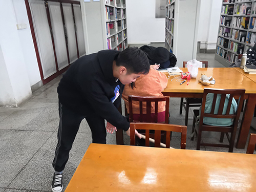 中午12时50分左右,支部志愿者们在大厅门口准时集合完毕并进行了签到。随后,团支书贾娴介绍道,按照图书馆方负责人的指示,本次班级志愿活动需要安排六位同学在五楼,五位同学在六楼,六位同学在七楼。于是,支部志愿者们先是来到了五楼,在五楼负责老师的指导下,支部志愿者们了解到了本次志愿服务活动的内容――六位同学需要负责在五楼进行擦桌子和拖地。于是,团支书贾娴安排了六位同学留在五楼,他们在老师的指导下开始拿着抹布、拖把开始搞卫生。然后余下的志愿者们来到了六楼。六楼负责老师则是讲到一共需要五位同学,三位同学负责擦拭书架,两位同学负责拖地。在安排好留下的五位同学后,团支书贾娴带着最后几位志愿者来到了七楼。七楼的负责老师则是安排六位志愿者进行书架上书籍的整理工作,即需要按照序号把书籍排列好,并且排列工整、美观。短暂的安排下,各层支部志愿者们纷纷就位,开始自己干活。他们整理书籍,他们擦拭书架,他们认真拖地……支部志愿者们专注于自己眼前的事情,手再麻再酸痛也不喊苦喊累,忙碌但不吵闹。中午的这个时间,图书馆自习的同学也十分安静,或者伏案午休,或者继续学习,一切都显得是那么的和谐美好。