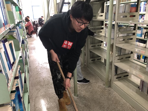 下午三点整,全体同学按时来到图书馆门口,分别在团支书张雨藤同学和学习委员郭晓雷同学的带领下,前往七楼和三楼去完成各自的任务。一些同学负责清扫书架上的灰尘,另外的同学负责拖地,在楼层老师的带领下,每位同学都奔赴自己的岗位,开始劳动。