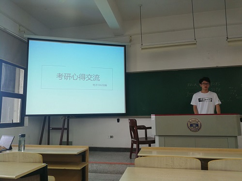 第一位上台分享的是来自电子1501班的陈飞同学,他主要就考研本校专业讲述,分为考研形势、考研科目、当下以及未来任务、考研时间安排四个方面。他强调专业课务必要学好,因其涉及考研科目、影响考研成绩,为此又向同学们推荐了一些相关书籍以供学习参考。
