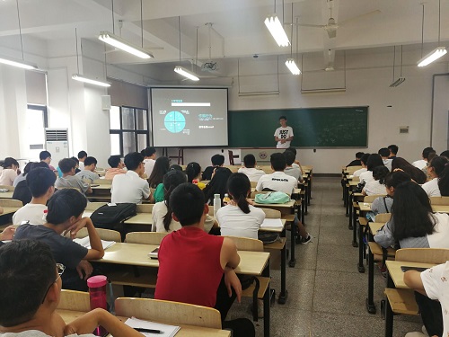最后,向同学们分享出国留学经验的是来自电子1601班的刘臻昊同学,赴美参与ASU交流项目回来的他,以其幽默风趣的风格向同学们介绍留学申请流程以及他在美国的学习生活。他告诉同学们出国留学应提前做好学籍、办证等方面的充足准备,强调语言不是障碍,也说明了国内外学习模式以及氛围上的一些差异。