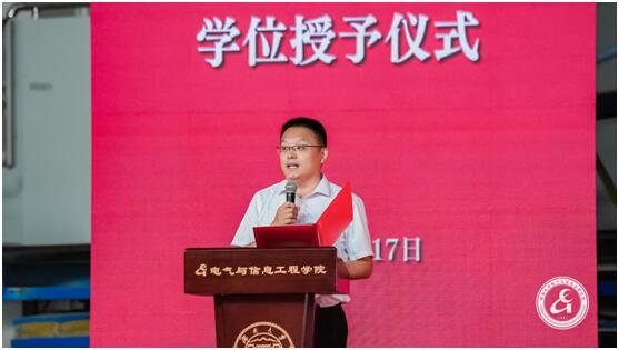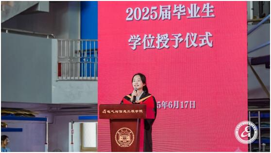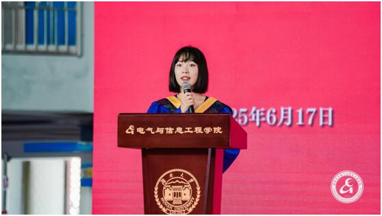 优秀研究毕业生代表张夏伊维回顾了九年湖大时光织就的温柔岁月,在“本科生——辅导员——研究生”的接力棒传递中她实现了“育人者终被育”的生动回环。在校长寄语、校友情怀的熏陶下,她以真才实干反哺回馈每一分来自学校、学院的爱意。最后她寄语同窗以岳麓山为精神坐标,做发光发热的电气人。