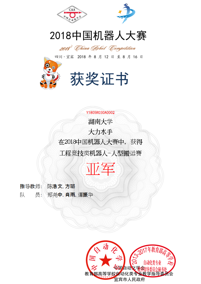 2018年中国机器人大赛亚军1项、一等奖2项;