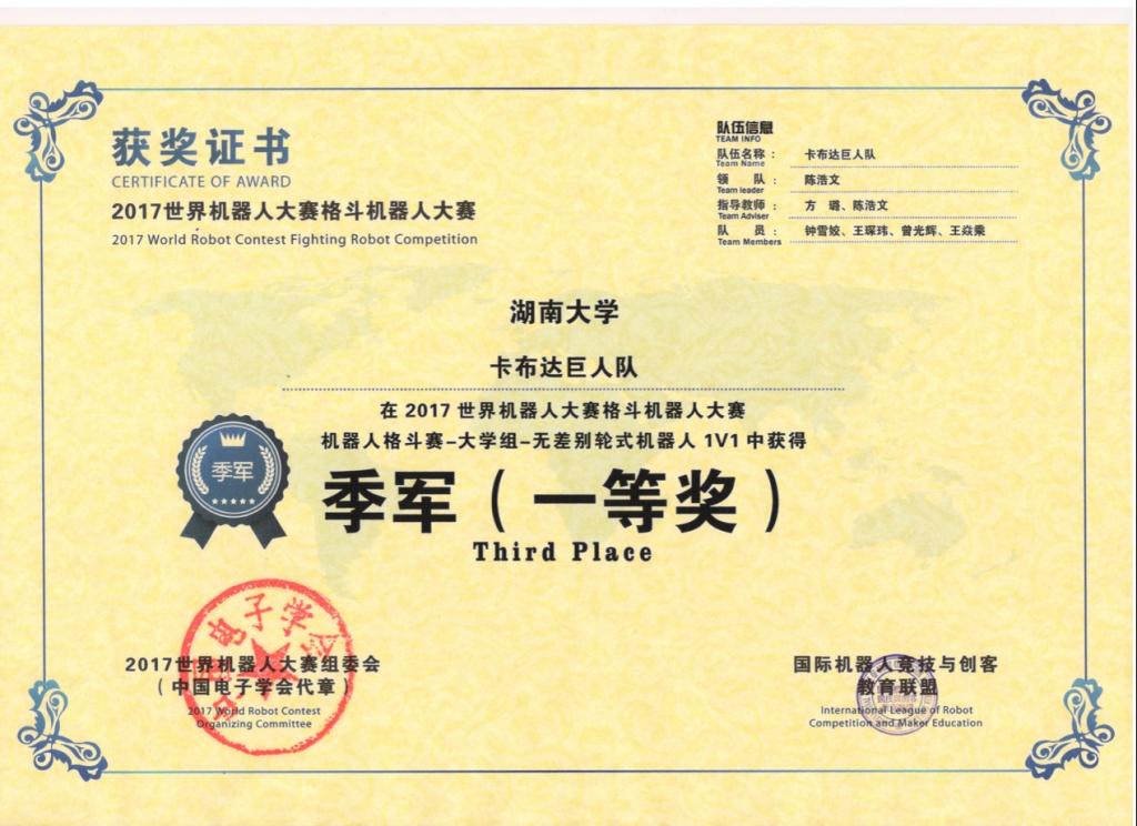 2017世界机器人大赛格斗机器人大赛一等奖1项;