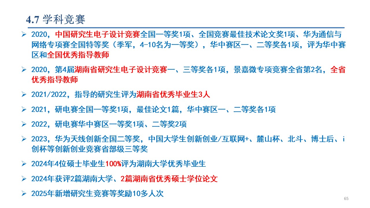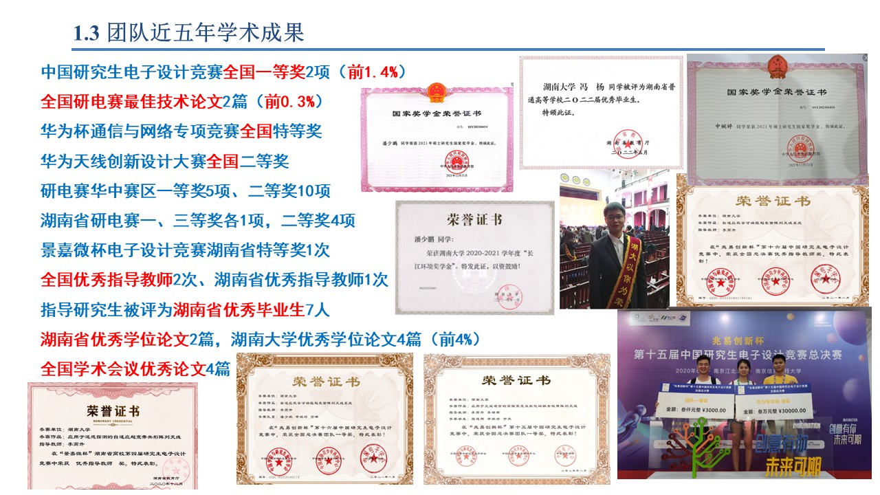 作为指导教师获得研究生电子设计竞赛全国一等奖(前1.4%)2项、二/三等奖各1项,全国研电赛最佳技术论文(前0.3%)2篇,华为通信与网络竞赛全国特等奖1项、天线创新赛全国二等奖1项、射频挑战赛全国三等奖2项,景嘉微杯电子设计竞赛全省特等奖1次,研电赛华中赛区一等奖7项、二等奖10多项,湖南省研电赛一/三等奖各1项、二等奖4项,全国学术会议优秀论文奖4项,湖南省电子学会优秀论文一等奖1项,互联网+/博士后/北斗应用/麓山杯/i创杯等创新创业大赛省部级奖励10多项,被评为全国优秀指导教师2次、湖南省优秀指导教师1次,成人网站